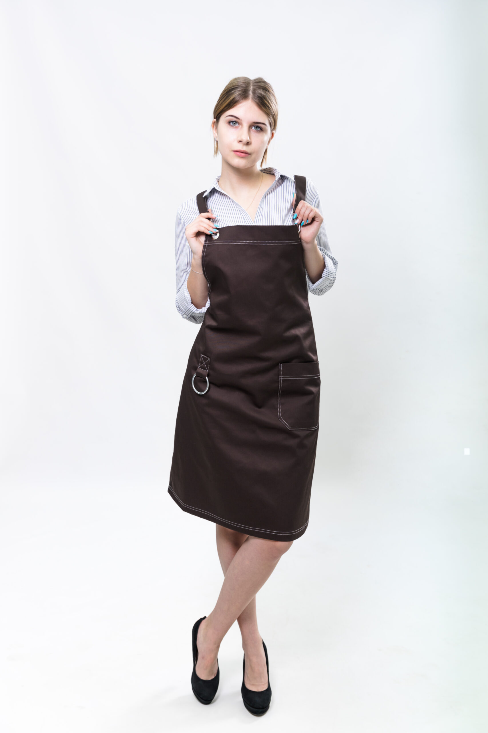 Практичний та сучасний фартух глибокого коричневого кольору. Виконаний зі щільної зносостійкої тканини, стійкої до забруднень та частого прання. Завдяки регулюванню на люверсах легко підлаштовується під будь-яку фігуру, забезпечуючи комфорт у щоденній роботі. Підходить для кухарів, барист, майстрів салонів та сфери обслуговування.