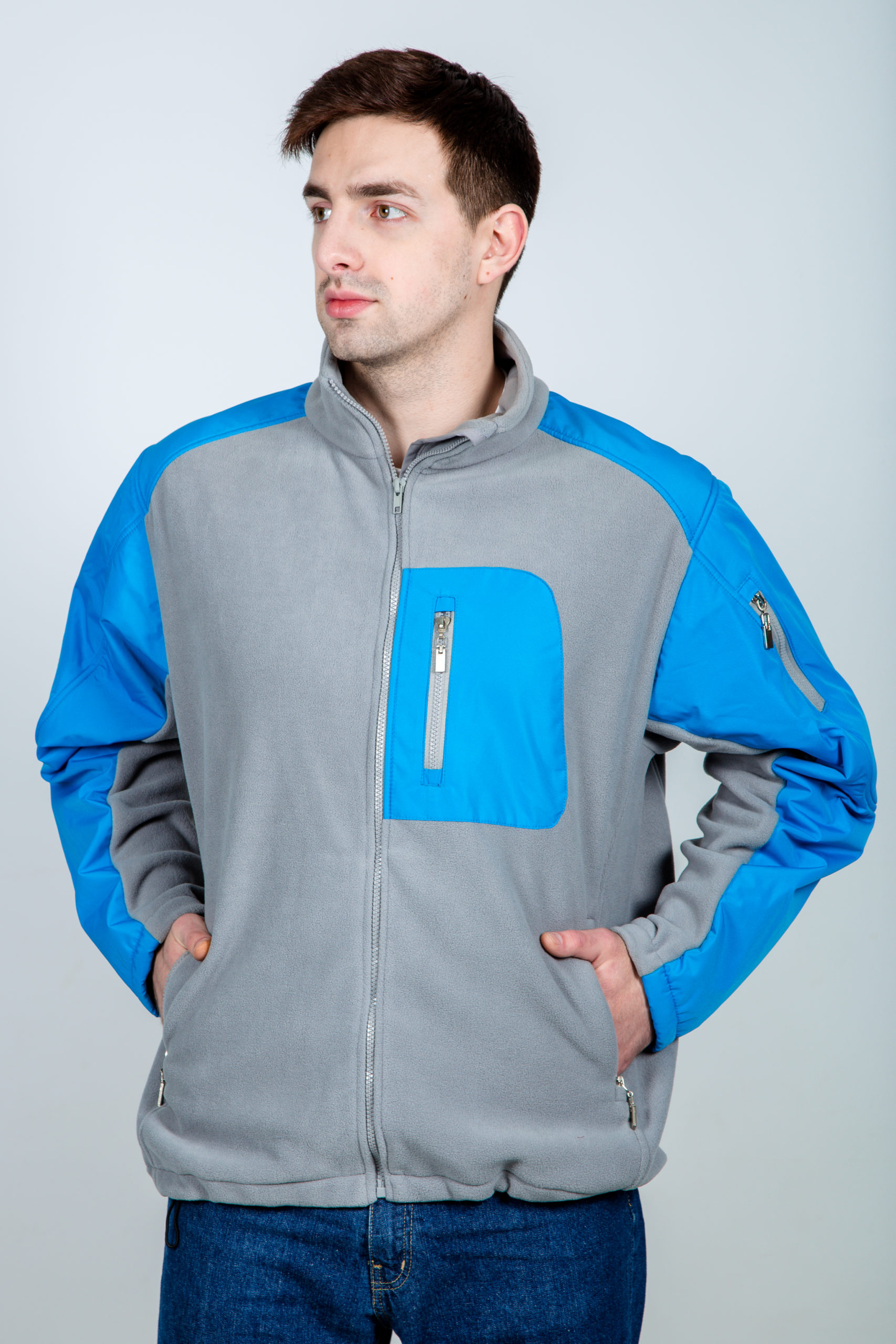 Зручна та тепла флісова кофта з вставками з плащової тканини – ідеальний варіант для роботи та активного відпочинку. Виготовлена з м’якого та приємного на дотик флісу, забезпечує комфорт і надійний захист від прохолоди. Оснащена блискавкою по всій довжині та декількома практичними кишенями. Легка у догляді, швидко сохне та зберігає тепло навіть у вологих умовах. Поєднання сірого та блакитного кольорів додає сучасного вигляду.