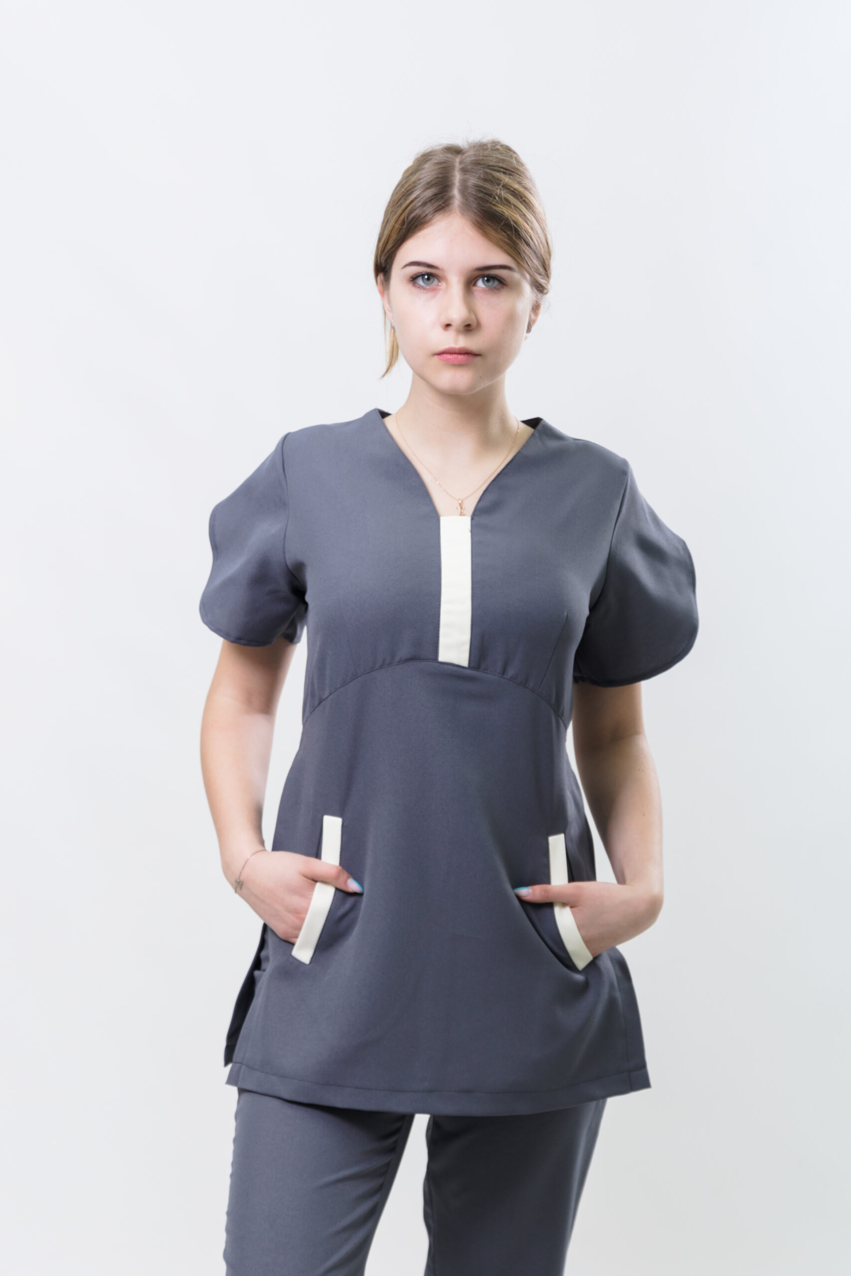 Стильний та практичний костюм для покоївок, з міцного габардину сірого кольору з білими вставками. Ергономічний крій забезпечує комфорт під час активної роботи, а поєднання сірого та білого створює акуратний і професійний вигляд. Високоякісні матеріали легко прати та доглядати, що робить костюм ідеальним для щоденного використання.